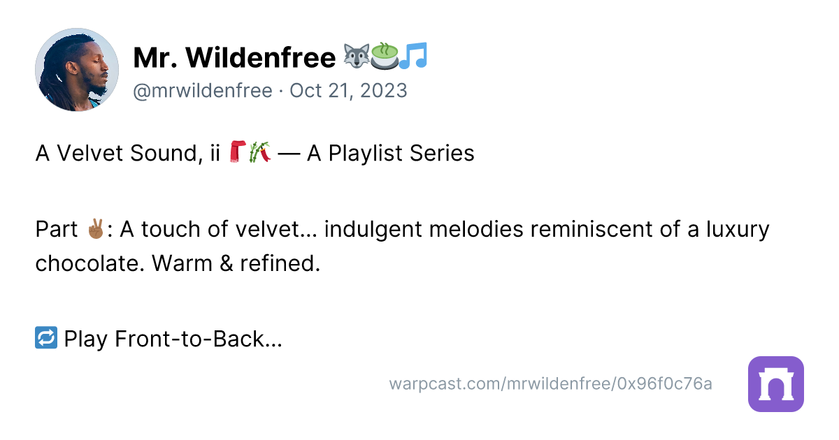 For now, I wish to share that I have indeed begun to publicly share some of my curated playlists — as in actively calling for attention on them, starting with "A Velvet Sound, I 🧣🌾". If you're on Farcaster, you might've seen me post about it at some point.